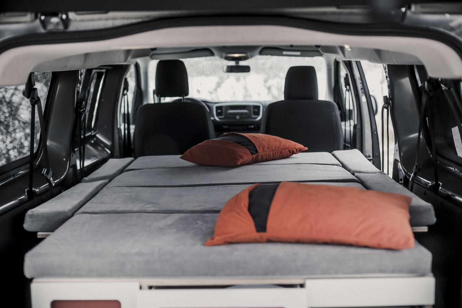 U postele je použit rošt s bočními výsuvy, čemuž je přizpůsobena i matrace. Ke spaní je tak využita celá šířka vozidla, čímž se rozšíří prostor pro to správné válení o 15 cm na každé straně.