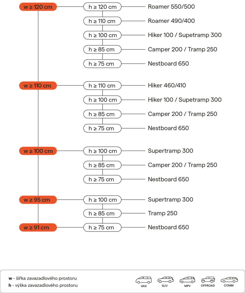 Zobrazená vozidla slouží pouze jako příklady testovaných aut. Kompatibilních modelů je mnohem více – vhodnost lze zpravidla určit podle šířky nejužšího místa v kufru a dostatečné výšky pro pohodlné spaní. Jaká vestavba se vejde do vašeho vozu? Pomoci vám může náš Size Guide.