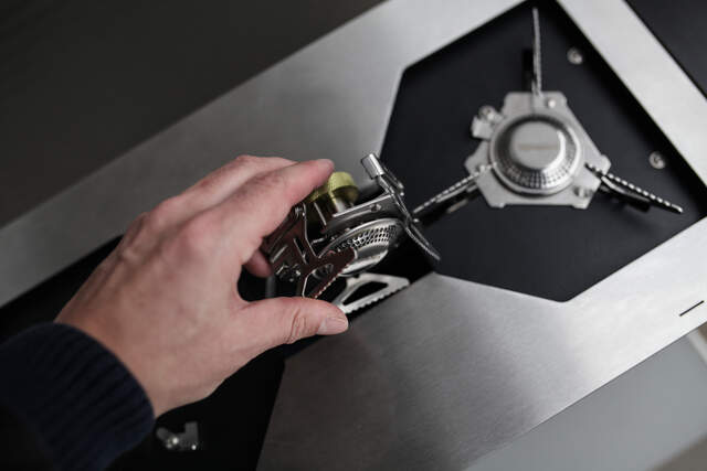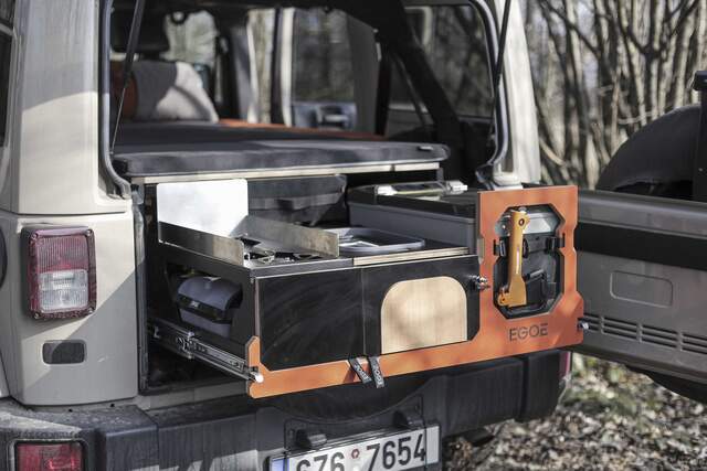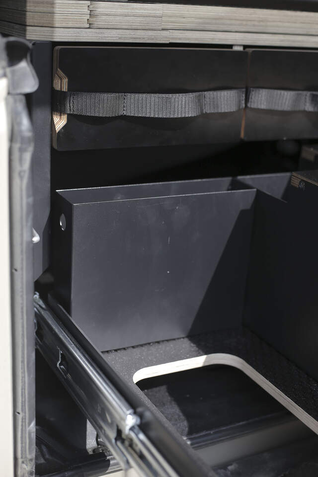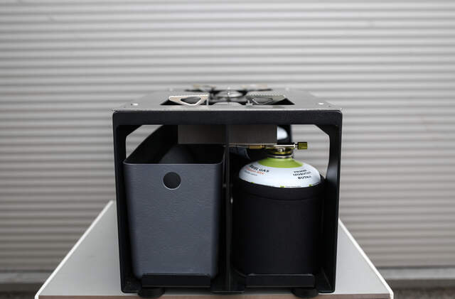 Das ganze Modul ist mobil und beidseitig verwendbar, d.h. dass es im Rahmen der Nestbox sowohl links als auch rechts platziert werden kann. Die Brenner können über die Mittelöffnung herausgenommen werden. Zum Modul gehört auch eine entnehmbare Kunststoffschublade für Küchenzubehör, die sich hinter dem Kocher befindet.