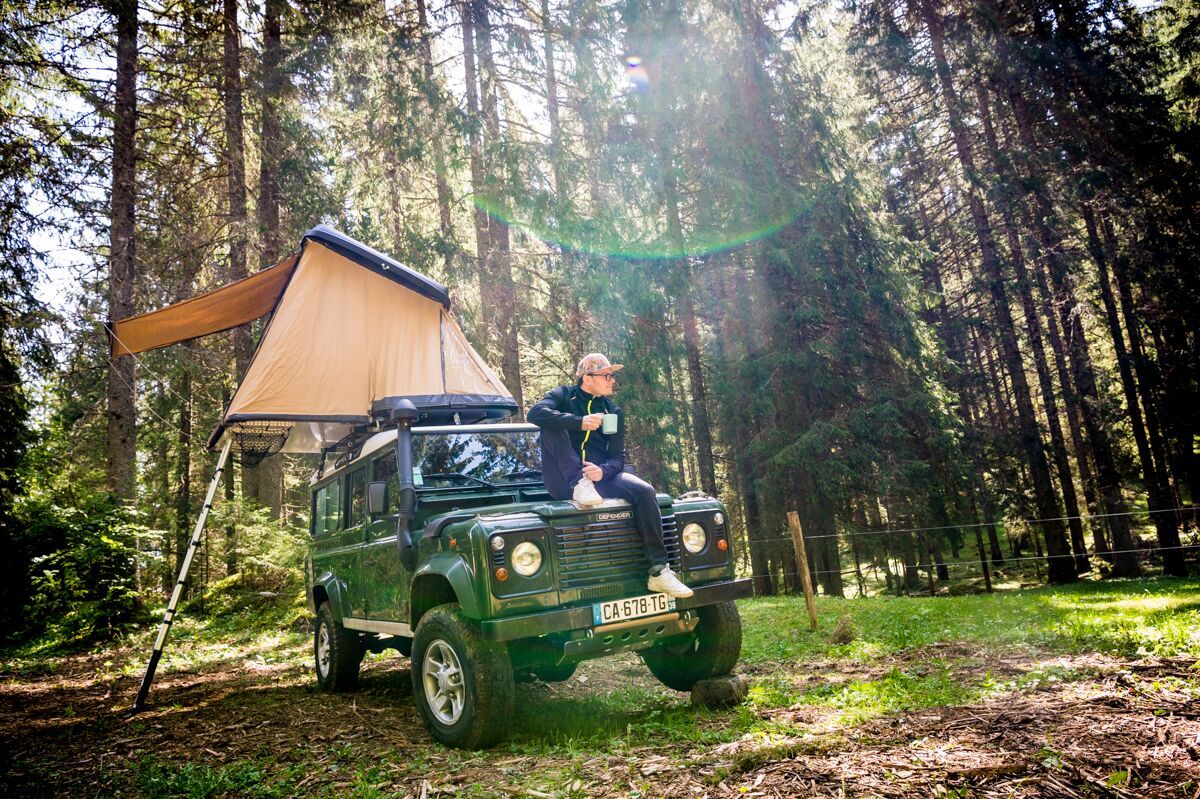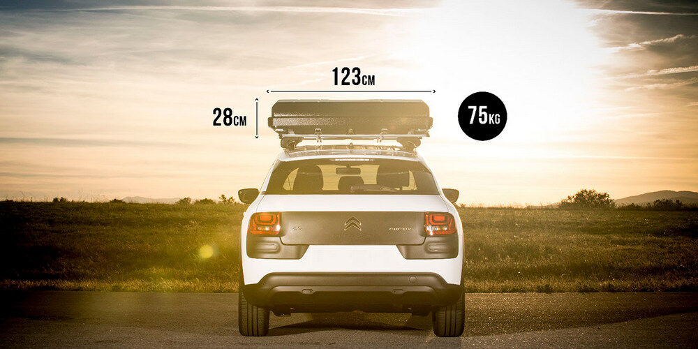 Hussarde Quatro tents have an aluminum floor attached to a roof rack, with a plastic case above it, between which is the fabric tent. The interior of the tent features Nestmattress mattresses (extra charge). An aluminum ladder is supplied with the tent as standard.
