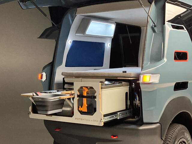Potential Motors is partnering with overland equipment experts Egoé on integrated kitchen and bed solutions for the Adventure 1 electric ORV (Off-road Recreational Vehicle). The custom designed camp module provides everything needed to cook and sleep in comfort in remote places. This will be the first vehicle to feature Egoé’s Nest concept as factory equipment.