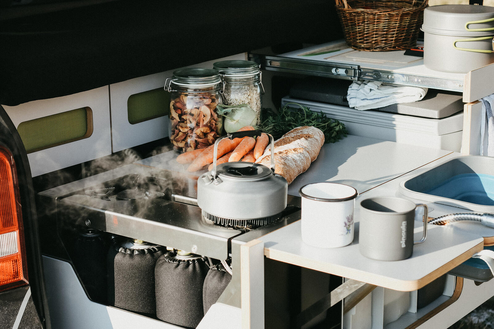 Wyjmowane moduły do skrzynek Nestbox. Moduł kuchenny zawiera 2 palniki i miejsce do przechowywania akcesoriów kuchennych i żywności. Moduł woda służy jako przestrzeń do mycia naczyń i higieny podstawowej.