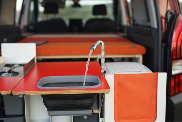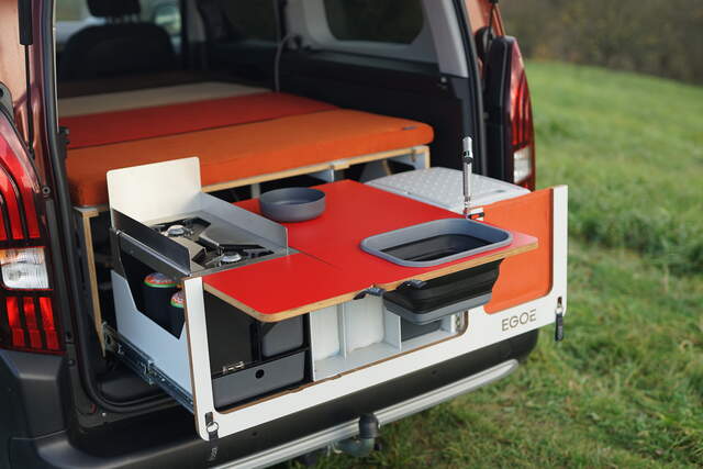 Kompletny zestaw+korpus, wyjmowany moduł wody i moduł kuchenki, miejsce przeznaczone na lodówkę, łóżko (stelaż z elementami bocznymi, materac z częściami bocznymi) |