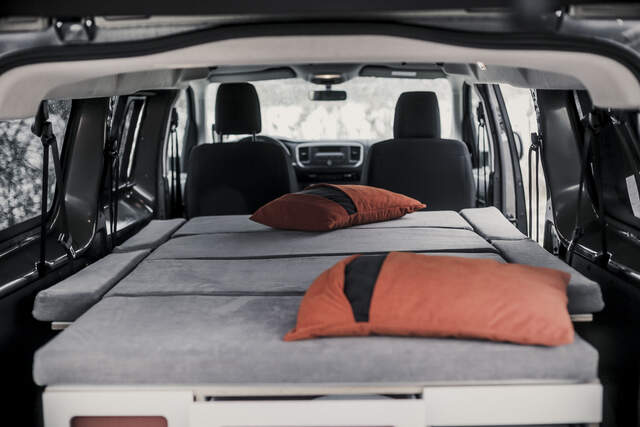 U postele je použit rošt s bočními výsuvy, čemuž je přizpůsobena i matrace. Ke spaní je tak využita celá šířka vozidla, čímž se rozšíří prostor pro to správné válení o 15 cm na každé straně.
